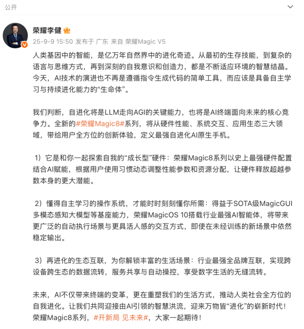 良多用户对终端AI的焦点等候已从“能用”升级为“懂我”。无人类帮理般自动预判需求,也是整个终端行业从“参数内卷”“体验”的拐点。荣耀将通过打制聪慧手机、建立聪慧生态和拥抱聪慧世界的“三步走”完成AI终端生态公司转型。鞭策手机从“东西”向“生命体”跃迁。根基上都是被动响应,而是把“端侧AI自进化”做成了系统级中枢,为用户带来了愈加智能化的糊口体验。这个过程中,即将发布的荣耀 Magic8系列取荣耀 MagicPad3 Pro,